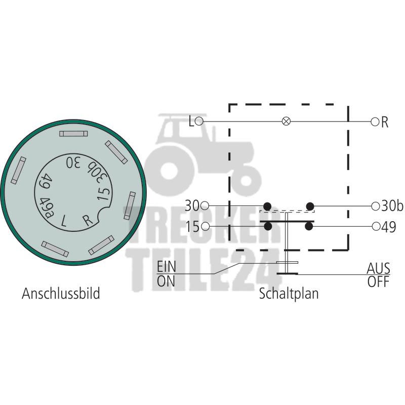 Ausführung: 12 / 24 Volt <br> Knopf gelb <br> mit Arretierung, <br> Ø 30 mm, 6 Flachsteckanschlüsse 6,3 x 0,8 (L- R- 30b- 30- 15- 49) <br> Staub- und Spritzwasserschutz <br> mit Glassockellampe 12 V / 1,2 W